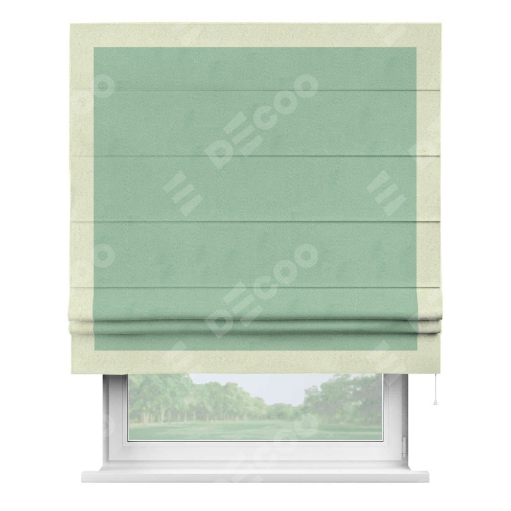 Римская штора производителя «Cortin», используется для проёма, пошита из ткани блэкаут однотонный ментоловый, артикул ткани 91572−1. Отделка шторы кантом «Чесс», ткань для канта используется из блэкаута однотонного разной расцветки на выбор. Имеет универсальный механизм и подходит для монтажа: на потолок, на стену и в нишу.
