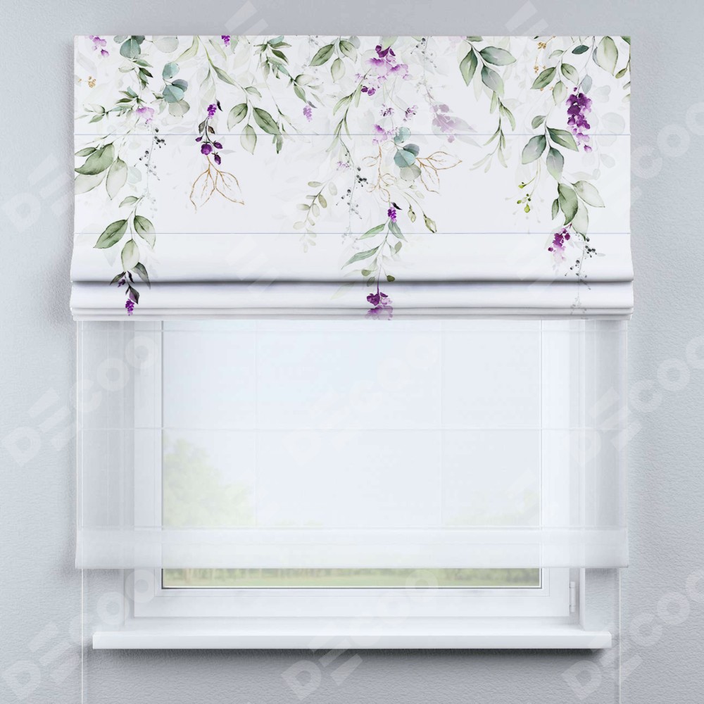 Двойная римская штора «День-ночь» от производителя Cortin предназначена для использования в проёмах. Эта штора уникальна тем, что состоит из двух полотен. На лицевой стороне находится блэкаут с нанесением сублимационной печати «Цветочный водопад», обеспечивающий эффективное затемнение. В комплект также входит вторая ткань — легкий белый тюль (артикул: V-01), который добавляет изящества и легкости оформлению окна. Кроме того, доступны и другие разновидности ткани тюль, выбор которых доступен по ссылке .