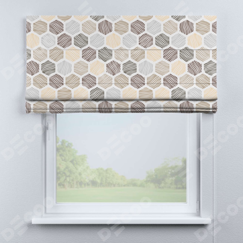 Классическая римская штора производителя «Cortin», пошита из ткани блэкаут с нанесением сублимационной печати «Мозаика соты». Имеет универсальный механизм и подходит для монтажа: на потолок, на стену и в нишу.