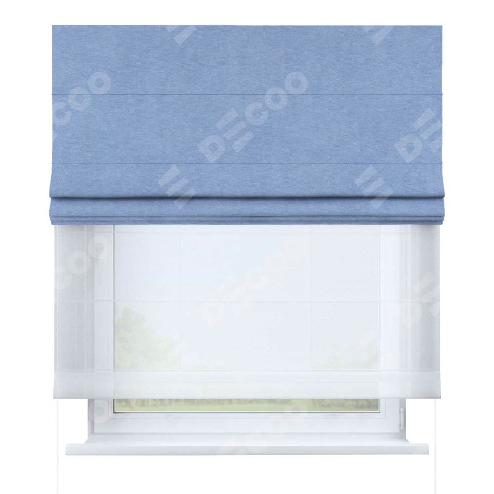 Двойная римская штора «День-ночь» от производителя Cortin предназначена для использования в проёмах. Эта штора уникальна тем, что состоит из двух полотен. На лицевой стороне находится вельвет васильковый (артикул: 33799), обеспечивающий мягкое затемнение. В комплект также входит вторая ткань — легкий белый тюль (артикул: V-01), который добавляет изящества и легкости оформлению окна. Кроме того, доступны и другие разновидности ткани тюль, выбор которых доступен по  ссылке .