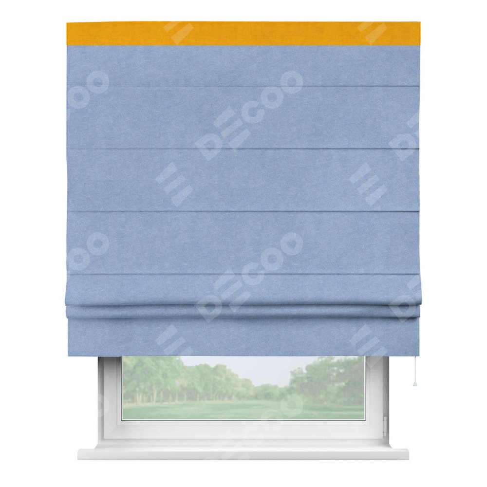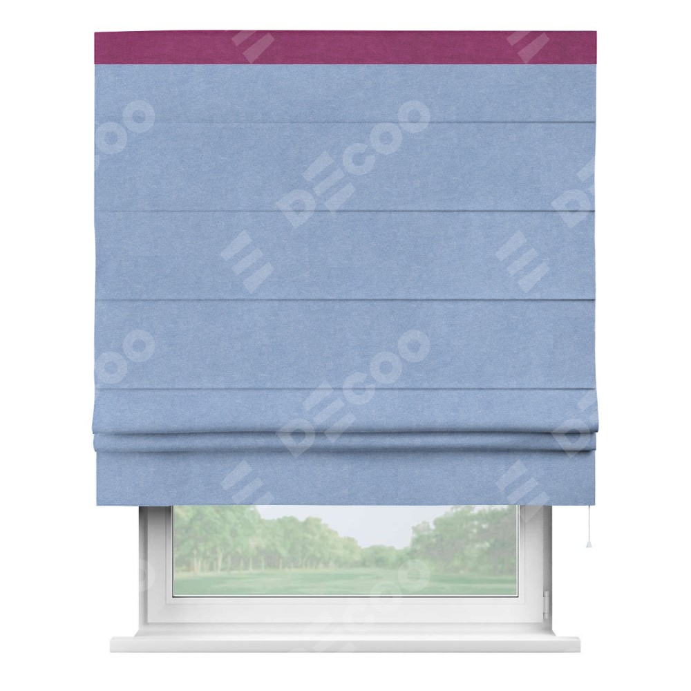 Римская штора производителя «Cortin», используется для проёма, пошита из ткани вельвет васильковый, артикул ткани 33799. Отделка шторы кантом «Кинг», ткань для канта используется из вельвета разной расцветки на выбор. Имеет универсальный механизм и подходит для монтажа: на потолок, на стену и в нишу.