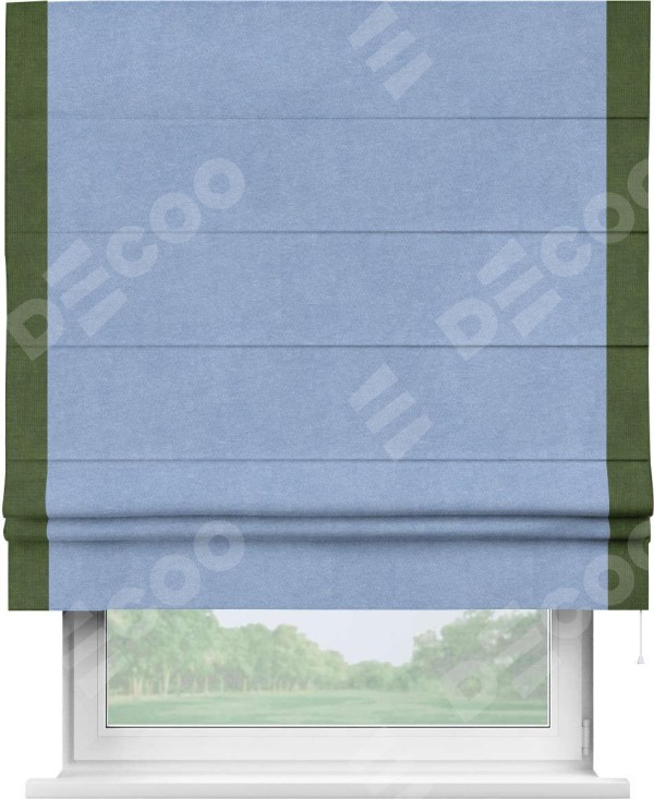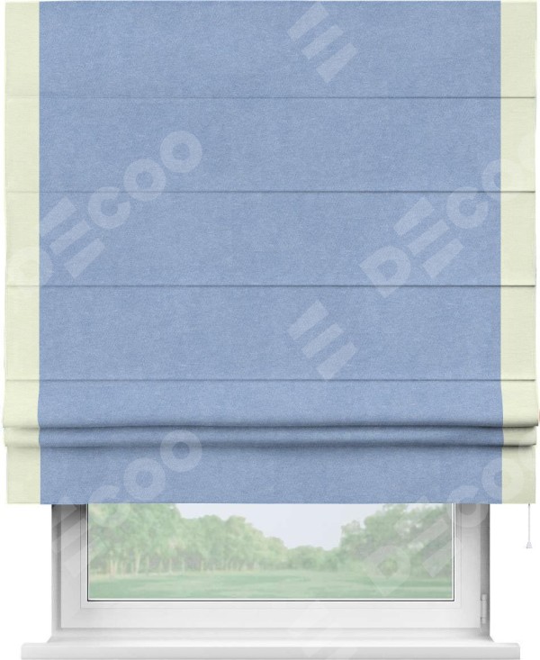 Римская штора производителя «Cortin», используется для проёма, пошита из ткани вельвет васильковый, артикул ткани 33799. Отделка шторы кантом «Стрим Дуо», ткань для канта используется из вельвета разной расцветки на выбор. Имеет универсальный механизм и подходит для монтажа: на потолок, на стену и в нишу.