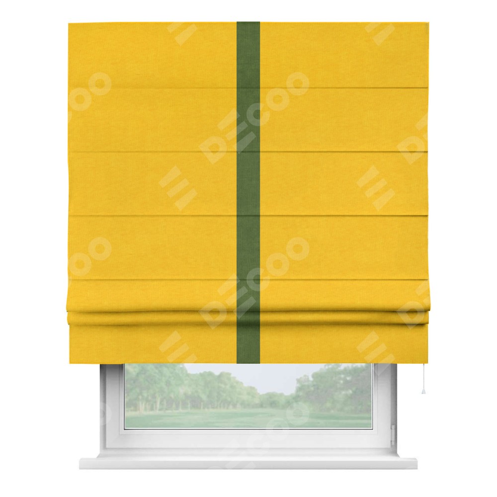 Римская штора производителя «Cortin», используется для проёма, пошита из ткани канвас желтый, артикул ткани v-344. Отделка шторы кантом «Хайвей» (трава v-473), ткань для канта используется из канваса разной расцветки на выбор. Имеет универсальный механизм и подходит для монтажа: на потолок, на стену и в нишу.