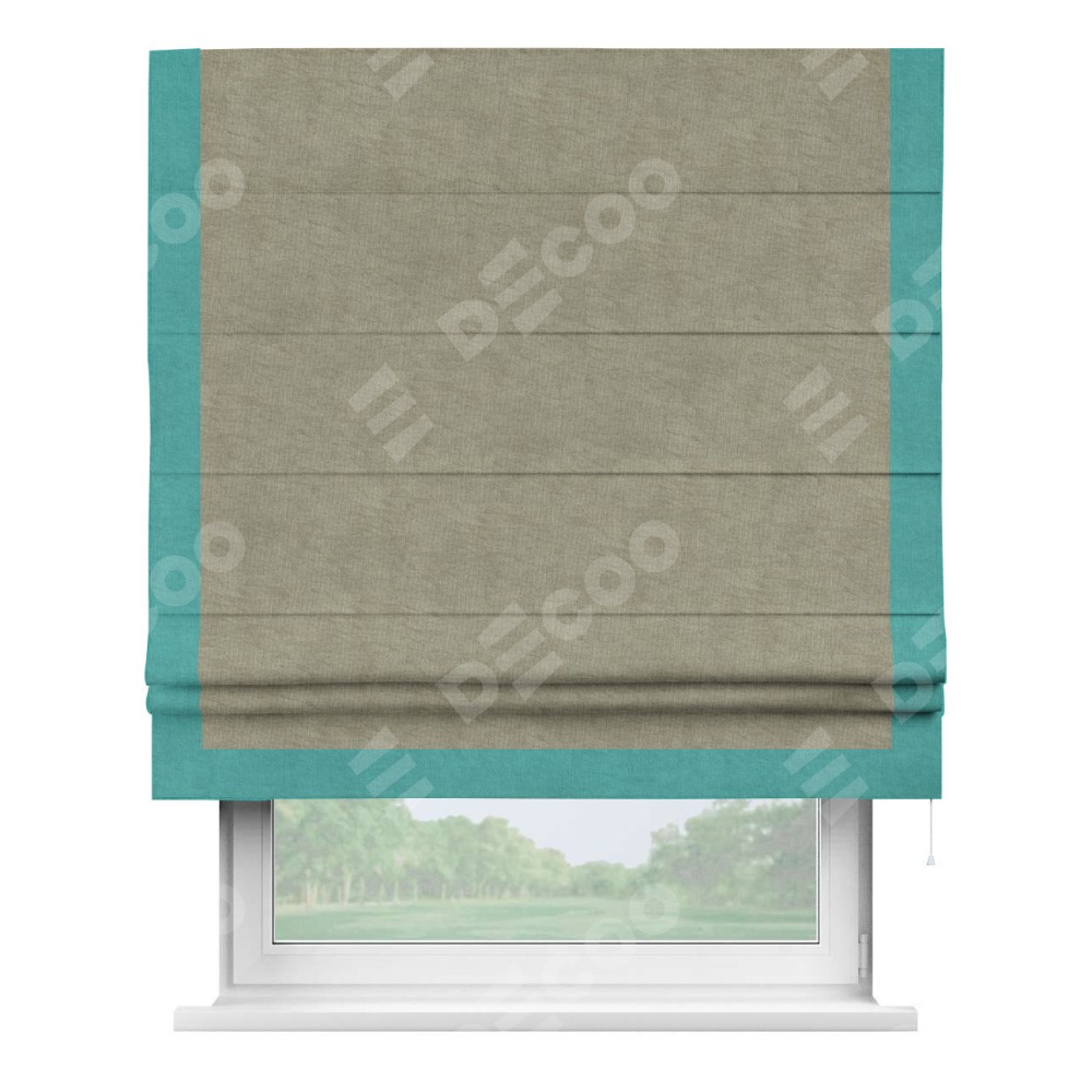 Римская штора производителя «Cortin», используется для проёма, пошита из ткани канвас капучино, артикул ткани v-211. Отделка шторы кантом «Виктория» (бирюзовый v-1048), ткань для канта используется из канваса разной расцветки на выбор. Имеет универсальный механизм и подходит для монтажа: на потолок, на стену и в нишу.