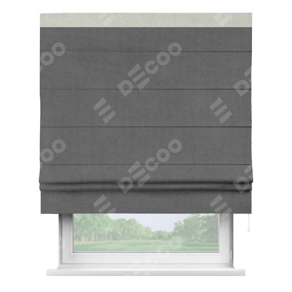 Римская штора производителя «Cortin», используется для проёма, пошита из ткани канвас мокрый асфальт, артикул ткани v-1083. Отделка шторы кантом «Кинг» (светло-серый v-371), ткань для канта используется из канваса разной расцветки на выбор. Имеет универсальный механизм и подходит для монтажа: на потолок, на стену и в нишу.