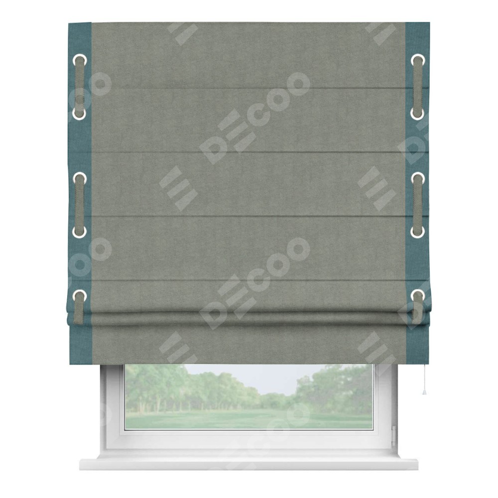 Римская штора производителя «Cortin», используется для проёма, пошита из ткани канвас сизый, артикул ткани v-1902. Отделка шторы кантом «Стрим Дуо» (ментоловый v-114) на кантах расположены люверсы с пояском, ткань для канта используется из канваса разной расцветки на выбор. Ткань для пояска обычно используется из основной ткани шторы, а так же можно сделать из любой расцветки по желанию. Имеет универсальный механизм и подходит для монтажа: на потолок, на стену и в нишу.