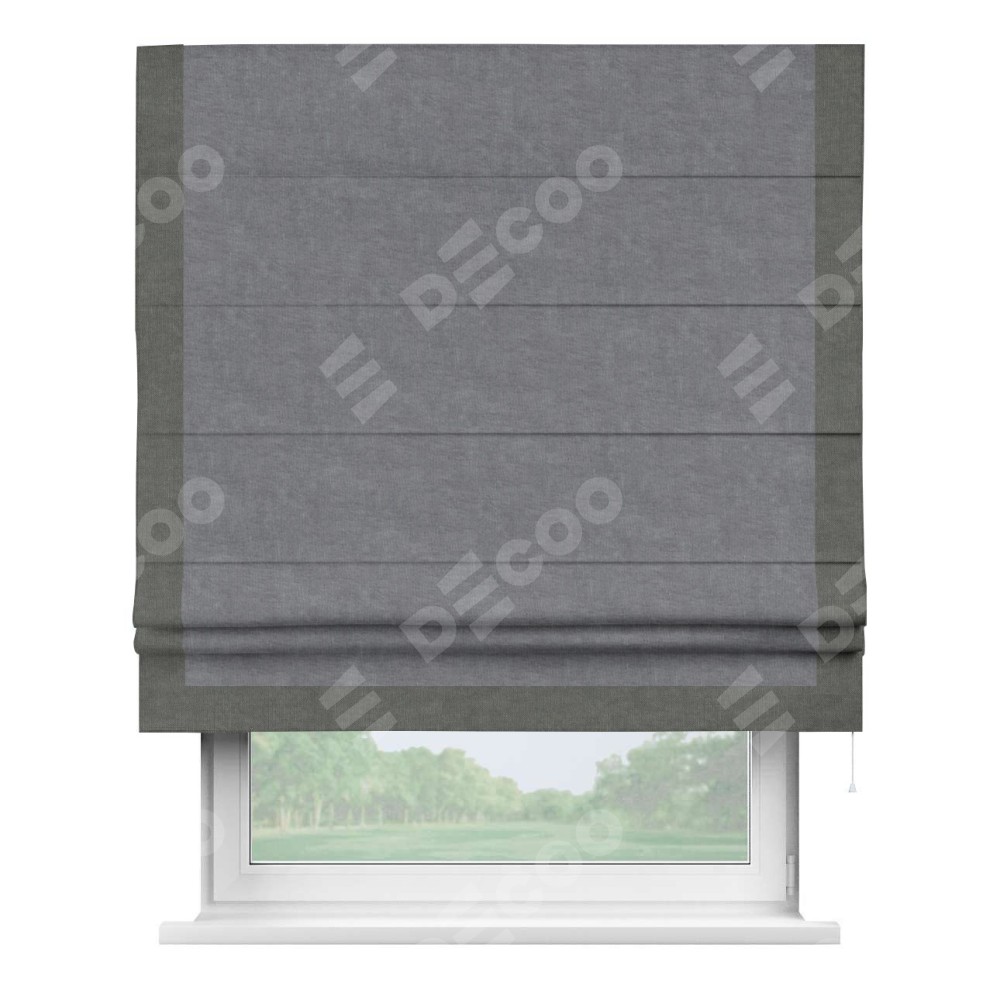 Римская штора производителя «Cortin», используется для проёма, пошита из ткани канвас стальной, артикул ткани v-1082. Отделка шторы кантом «Виктория» (тёмно-серый v-340), ткань для канта используется из канваса разной расцветки на выбор. Имеет универсальный механизм и подходит для монтажа: на потолок, на стену и в нишу.