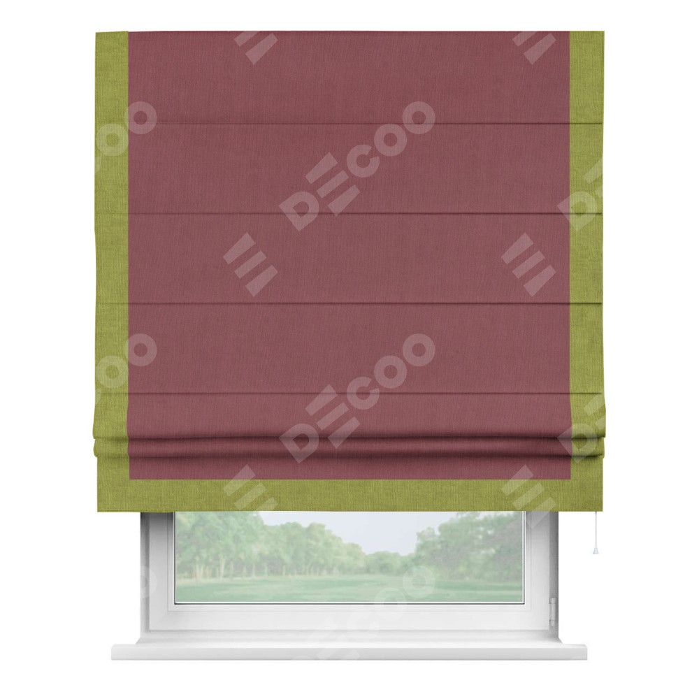 Римская штора производителя «Cortin», используется для проёма, пошита из ткани канвас ягодный, артикул ткани v-28. Отделка шторы кантом «Виктория» (зелёное яблоко v-370), ткань для канта используется из канваса разной расцветки на выбор. Имеет универсальный механизм и подходит для монтажа: на потолок, на стену и в нишу.