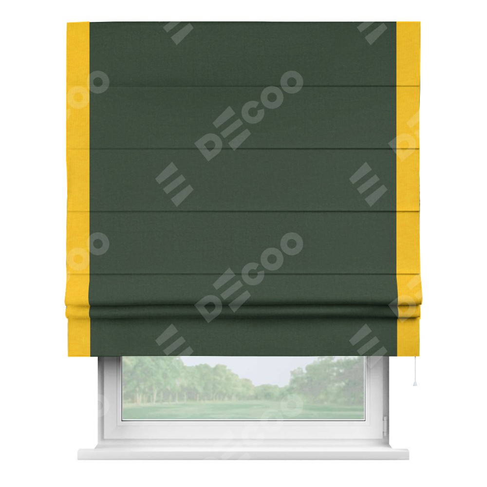 Римская штора производителя «Cortin», используется для проёма, пошита из ткани канвас глубокий зелёный, артикул ткани v-588. Отделка шторы кантом «Стрим Дуо» (желтый v-344), ткань для канта используется из канваса разной расцветки на выбор. Имеет универсальный механизм и подходит для монтажа: на потолок, на стену и в нишу.