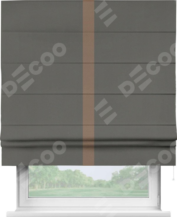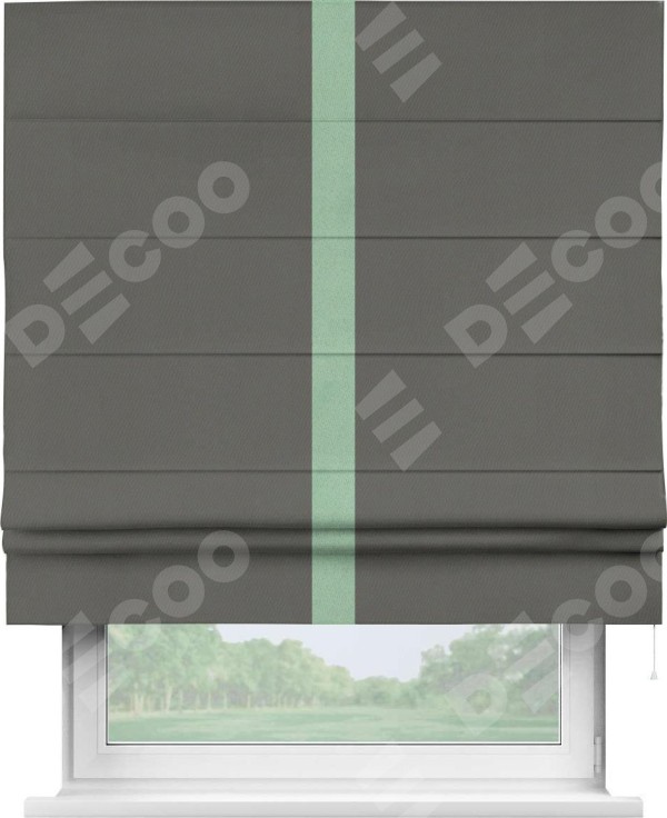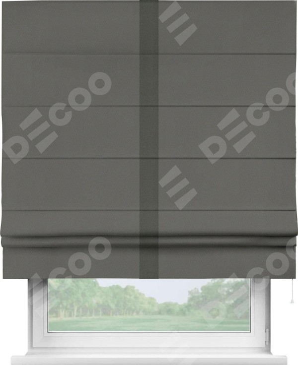 Римская штора производителя «Cortin», используется для проёма, пошита из ткани блэкаут однотонный тёмно-серый, артикул ткани 91570. Отделка шторы кантом «Хайвей», ткань для канта используется из блэкаута однотонного разной расцветки на выбор. Имеет универсальный механизм и подходит для монтажа: на потолок, на стену и в нишу.