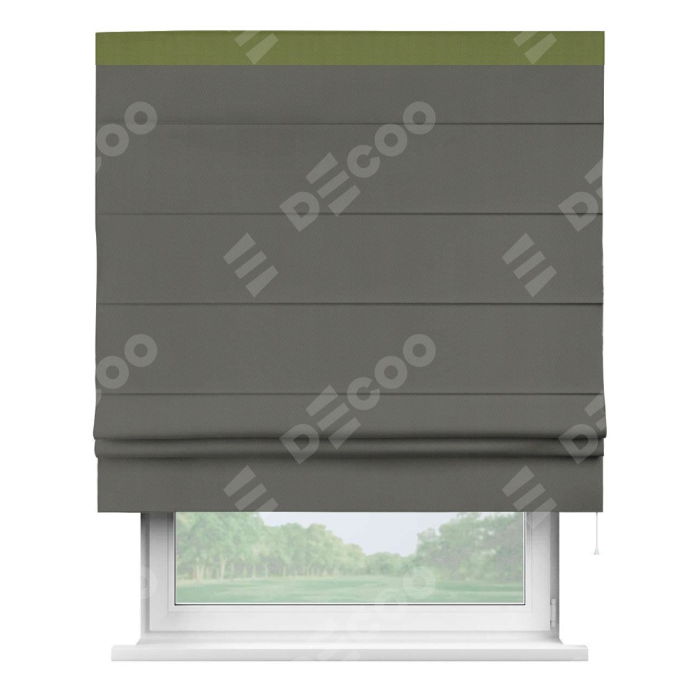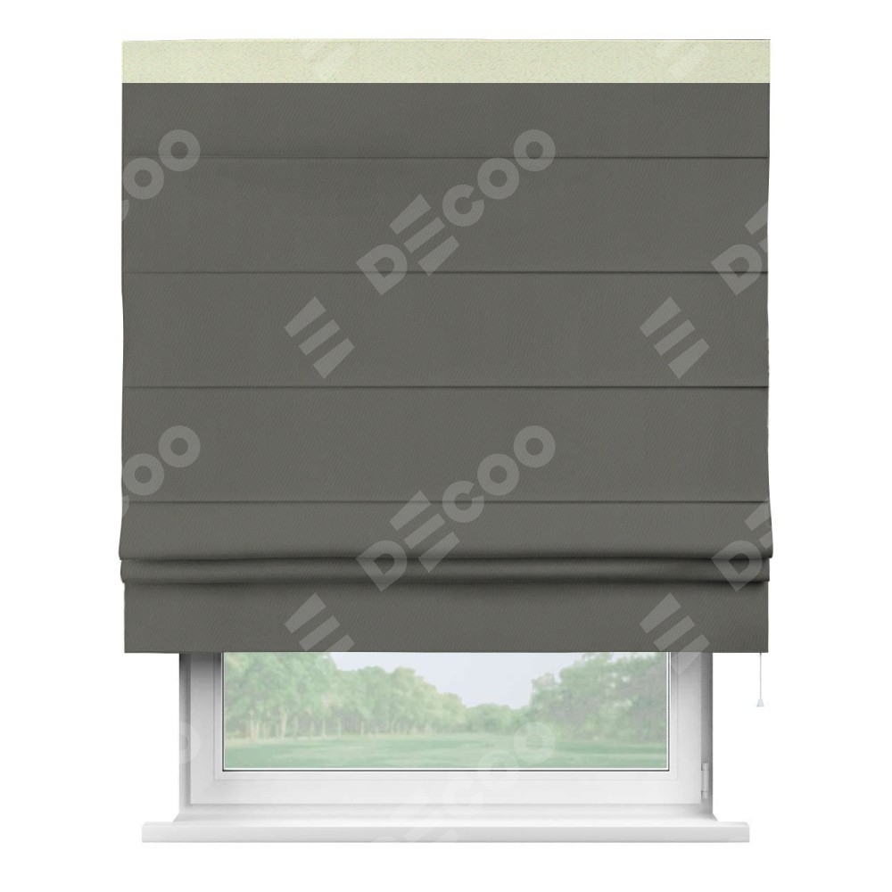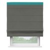 Римская штора производителя «Cortin», используется для проёма, пошита из ткани блэкаут однотонный тёмно-серый, артикул ткани 91570. Отделка шторы кантом «Кинг», ткань для канта используется из блэкаута однотонного разной расцветки на выбор. Имеет универсальный механизм и подходит для монтажа: на потолок, на стену и в нишу.