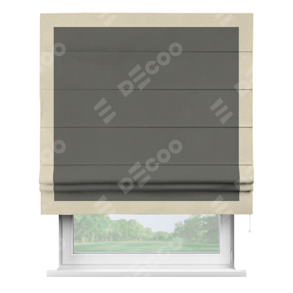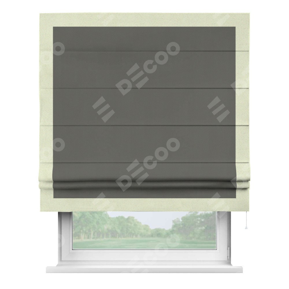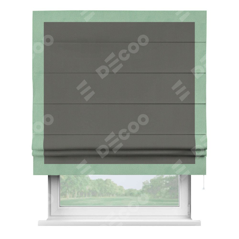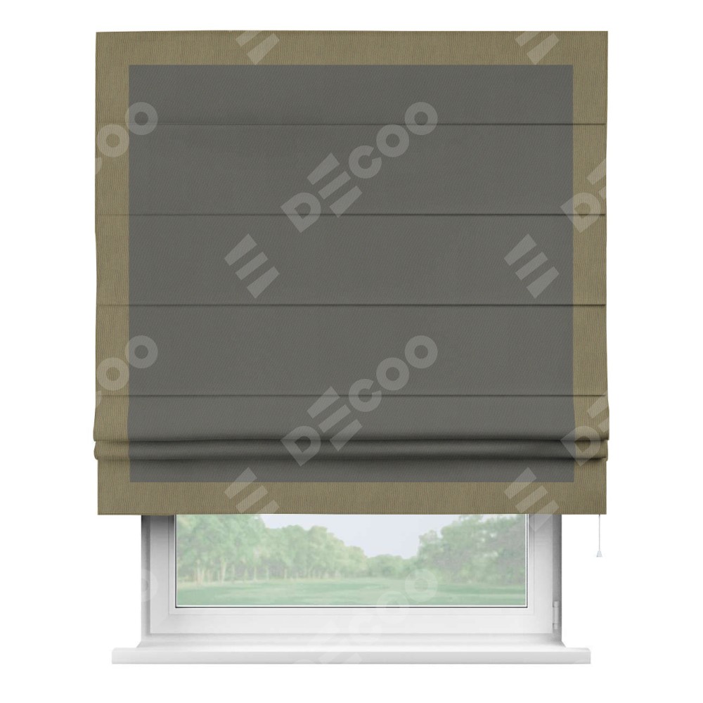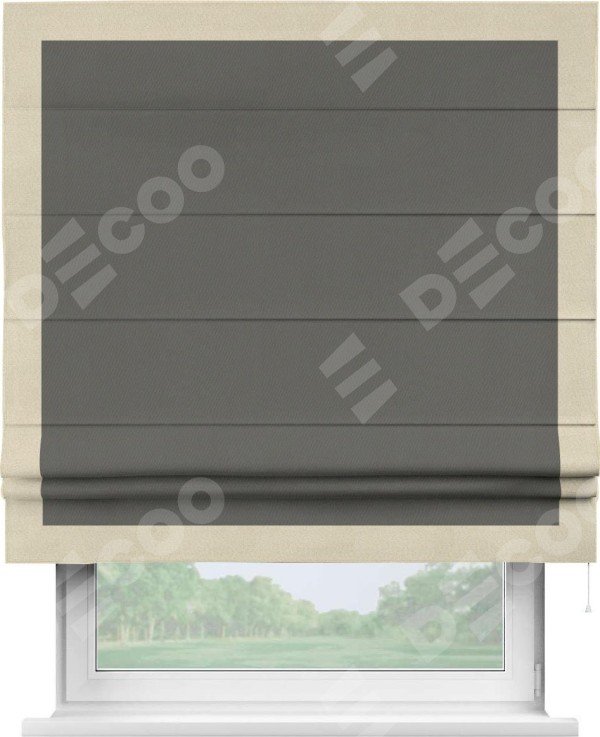 Римская штора производителя «Cortin», используется для проёма, пошита из ткани блэкаут однотонный тёмно-серый, артикул ткани 91570. Отделка шторы кантом «Чесс», ткань для канта используется из блэкаута однотонного разной расцветки на выбор. Имеет универсальный механизм и подходит для монтажа: на потолок, на стену и в нишу.