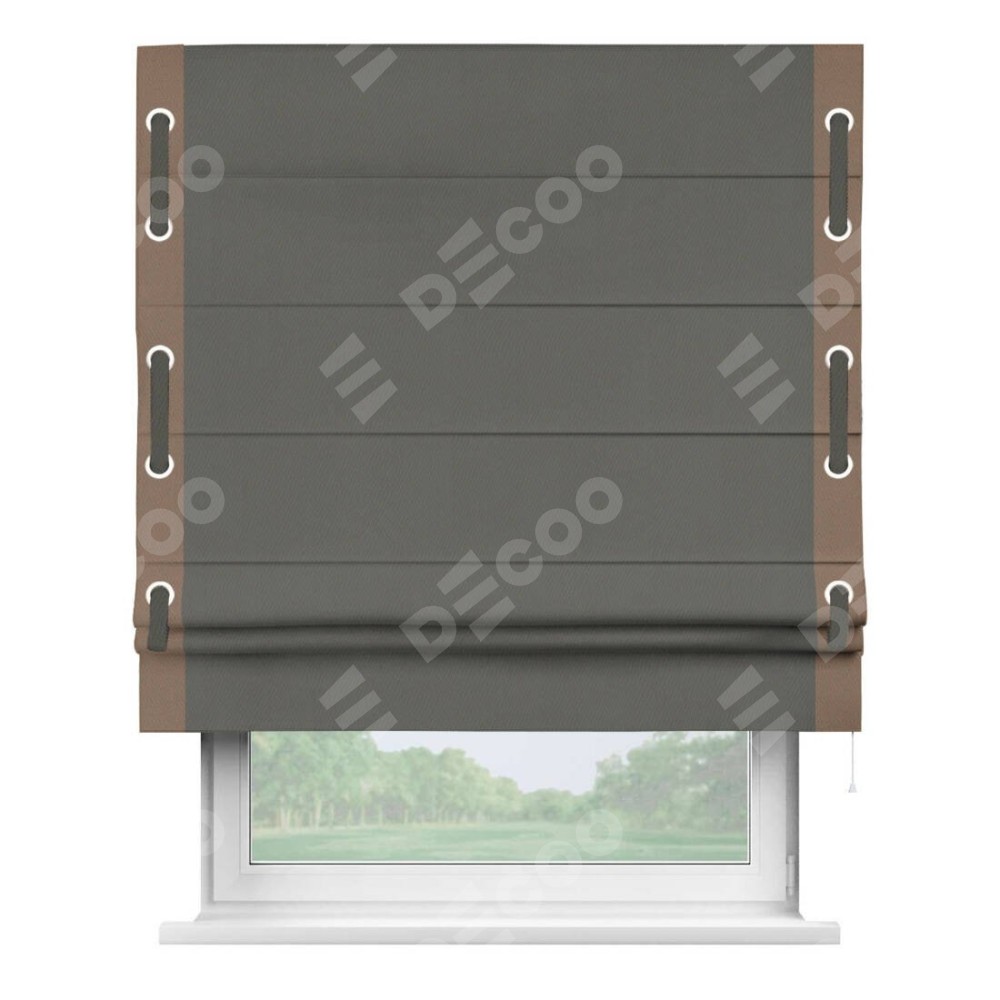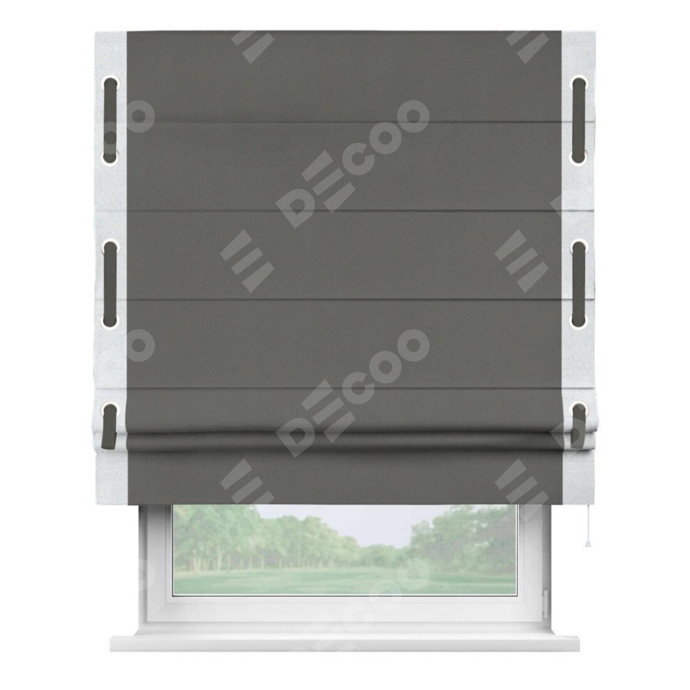 Римская штора производителя «Cortin», используется для проёма, пошита из ткани блэкаут однотонный тёмно-серый, артикул ткани 91570. Отделка шторы кантом «Стрим Дуо» на кантах расположены люверсы с пояском, ткань для канта используется из блэкаута однотонного разной расцветки на выбор. Ткань для пояска обычно используется из основной ткани шторы, а так же можно сделать из любой расцветки по желанию. Имеет универсальный механизм и подходит для монтажа: на потолок, на стену и в нишу.
