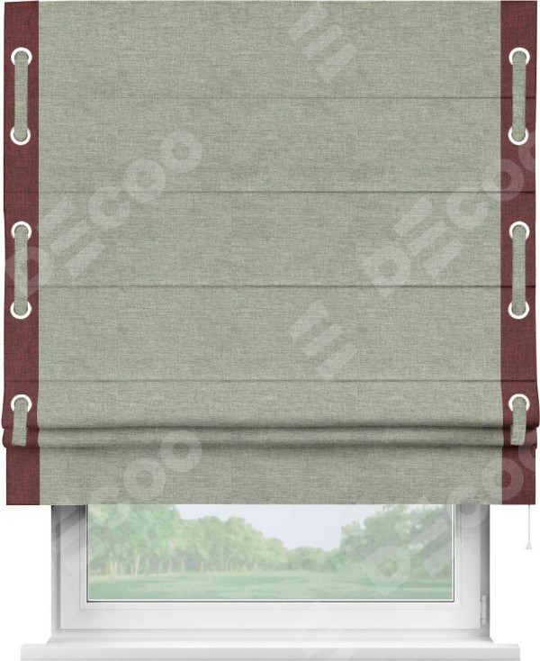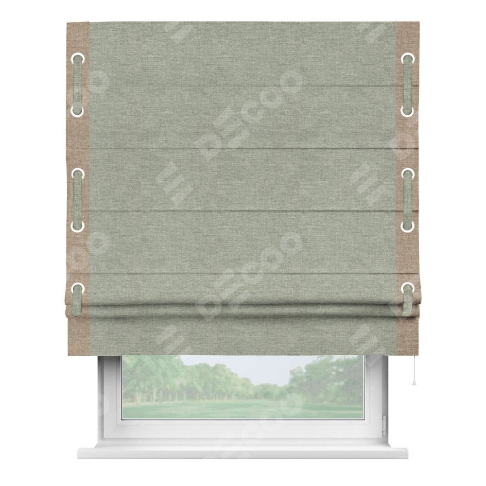 Римская штора производителя «Cortin», используется для проёма, пошита из ткани лён кашемир серый new, артикул 21618. Отделка шторы кантом «Стрим Дуо» на кантах расположены люверсы с пояском, ткань для канта используется из льна разной расцветки на выбор. Ткань для пояска обычно используется из основной ткани шторы, а так же можно сделать из любой расцветки по желанию. Имеет универсальный механизм и подходит для монтажа: на потолок, на стену и в нишу.