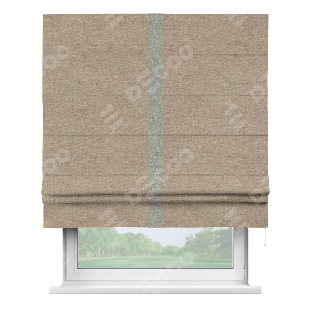 Римская штора производителя «Cortin», используется для проёма, пошита из ткани лён кашемир коричневый, артикул 21614. Отделка шторы кантом «Хайвэй», ткань для канта используется из льна разной расцветки на выбор. Имеет универсальный механизм и подходит для монтажа: на потолок, на стену и в нишу.
