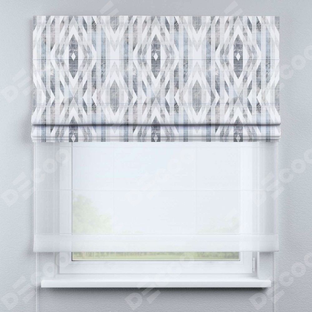Двойная римская штора «День-ночь» от производителя Cortin предназначена для использования в проёмах. Эта штора уникальна тем, что состоит из двух полотен. На лицевой стороне находится блэкаут с нанесением сублимационной печати «Триумф», обеспечивающий эффективное затемнение. В комплект также входит вторая ткань — легкий белый тюль (артикул: V-01), который добавляет изящества и легкости оформлению окна. Кроме того, доступны и другие разновидности ткани тюль, выбор которых доступен по  ссылке .