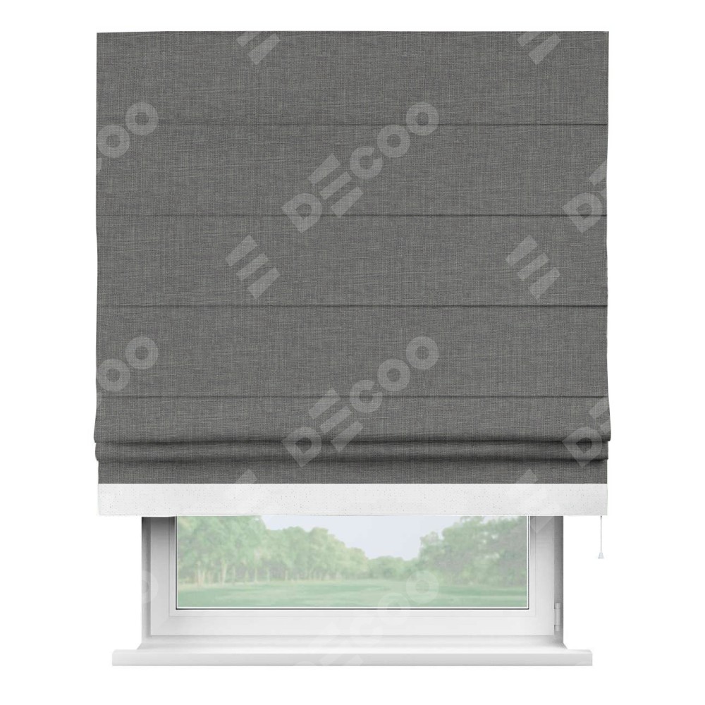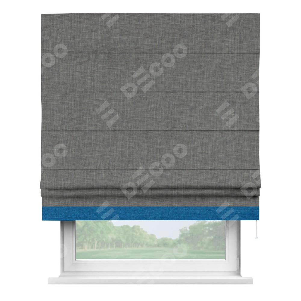 Римская штора производителя «Cortin», используется для проёма, пошита из ткани лён тёмно-серый, артикул 7441. Отделка шторы кантом «Джестер», ткань для канта используется из льна разной расцветки на выбор. Имеет универсальный механизм и подходит для монтажа: на потолок, на стену и в нишу.