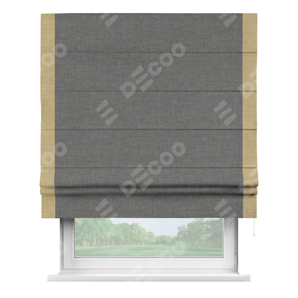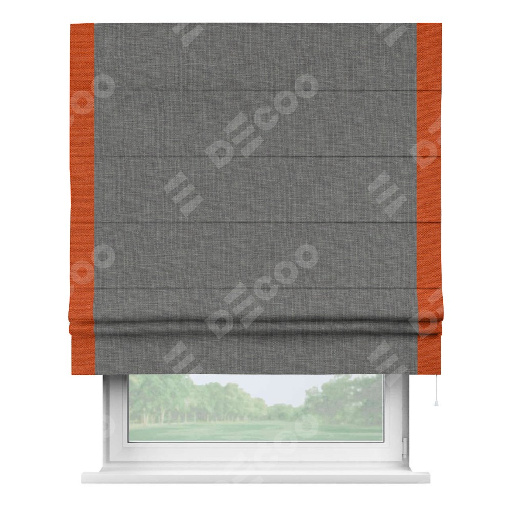 Римская штора производителя «Cortin», используется для проёма, пошита из ткани лён тёмно-серый, артикул 7441. Отделка шторы кантом «Стрим Дуо», ткань для канта используется из льна разной расцветки на выбор. Имеет универсальный механизм и подходит для монтажа: на потолок, на стену и в нишу.
