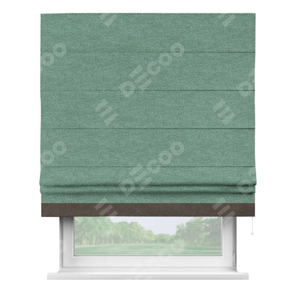 Римская штора производителя «Cortin», используется для проёма, пошита из ткани твид блэкаут бирюзовый, артикул 90934. Отделка шторы кантом «Джестер», ткань для канта используется из твида разной расцветки на выбор. Имеет универсальный механизм и подходит для монтажа: на потолок, на стену и в нишу.