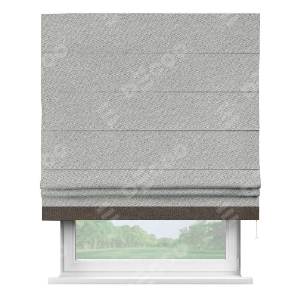 Римская штора производителя «Cortin», используется для проёма, пошита из ткани твид блэкаут светло-серый, артикул 90936. Отделка шторы кантом «Джестер», ткань для канта используется из твида разной расцветки на выбор. Имеет универсальный механизм и подходит для монтажа: на потолок, на стену и в нишу.