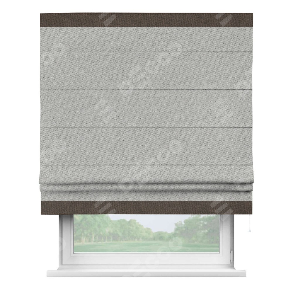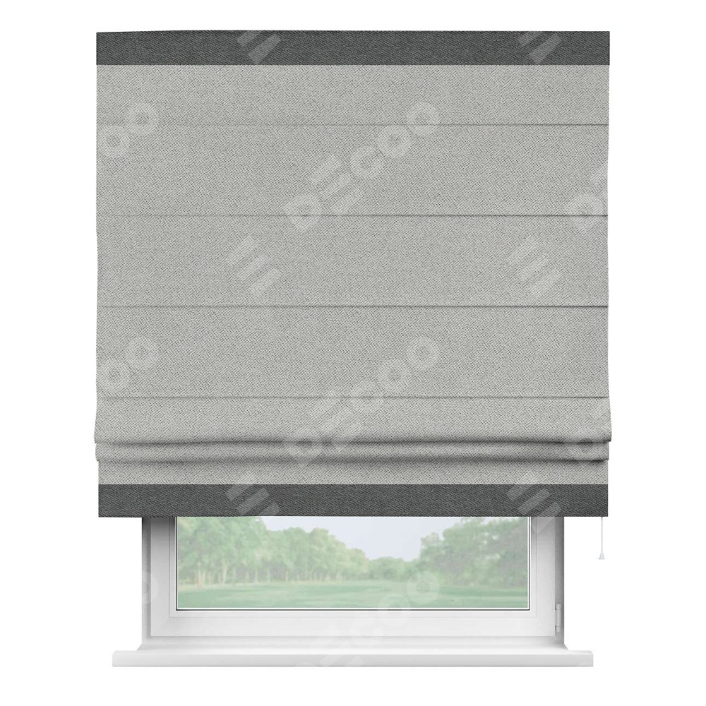 Римская штора производителя «Cortin», используется для проёма, пошита из ткани твид блэкаут светло-серый, артикул 90936. Отделка шторы кантом «Горизонт», ткань для канта используется из твида разной расцветки на выбор. Имеет универсальный механизм и подходит для монтажа: на потолок, на стену и в нишу.