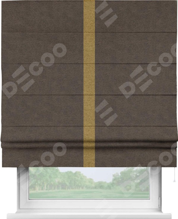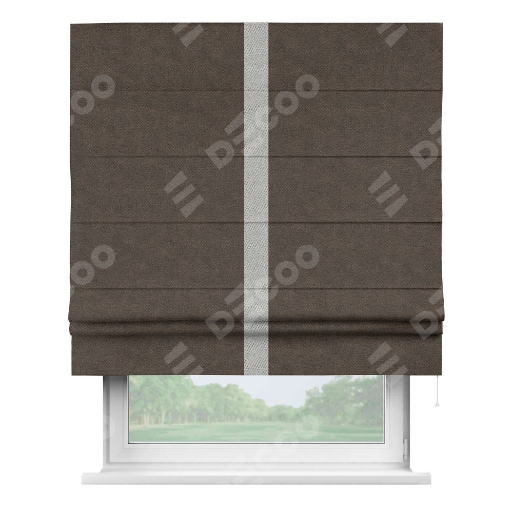 Римская штора производителя «Cortin», используется для проёма, пошита из ткани твид блэкаут тёмно-коричневый, артикул 90933. Отделка шторы кантом «Хайвэй», ткань для канта используется из твида разной расцветки на выбор. Имеет универсальный механизм и подходит для монтажа: на потолок, на стену и в нишу.