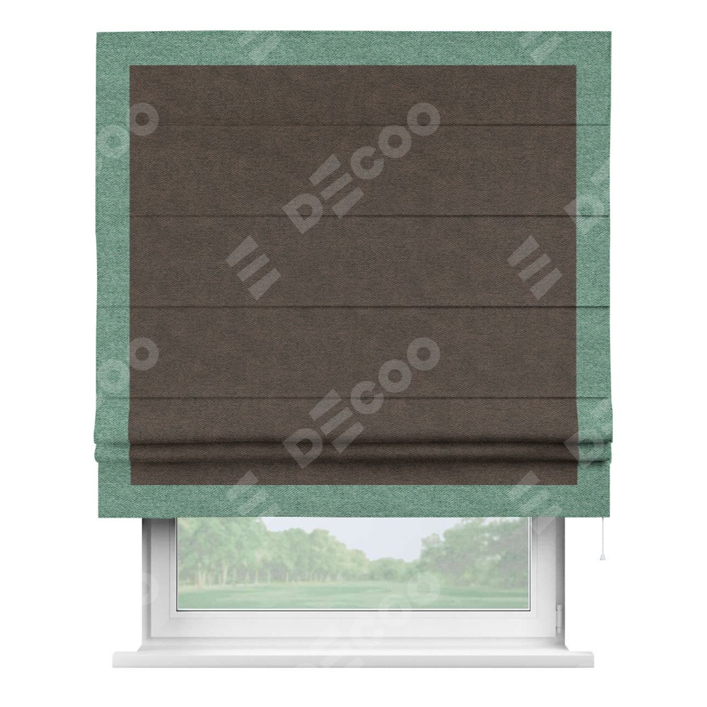 Римская штора производителя «Cortin», используется для проёма, пошита из ткани твид блэкаут тёмно-коричневый, артикул 90933. Отделка шторы кантом «Чесс», ткань для канта используется из твида разной расцветки на выбор. Имеет универсальный механизм и подходит для монтажа: на потолок, на стену и в нишу.