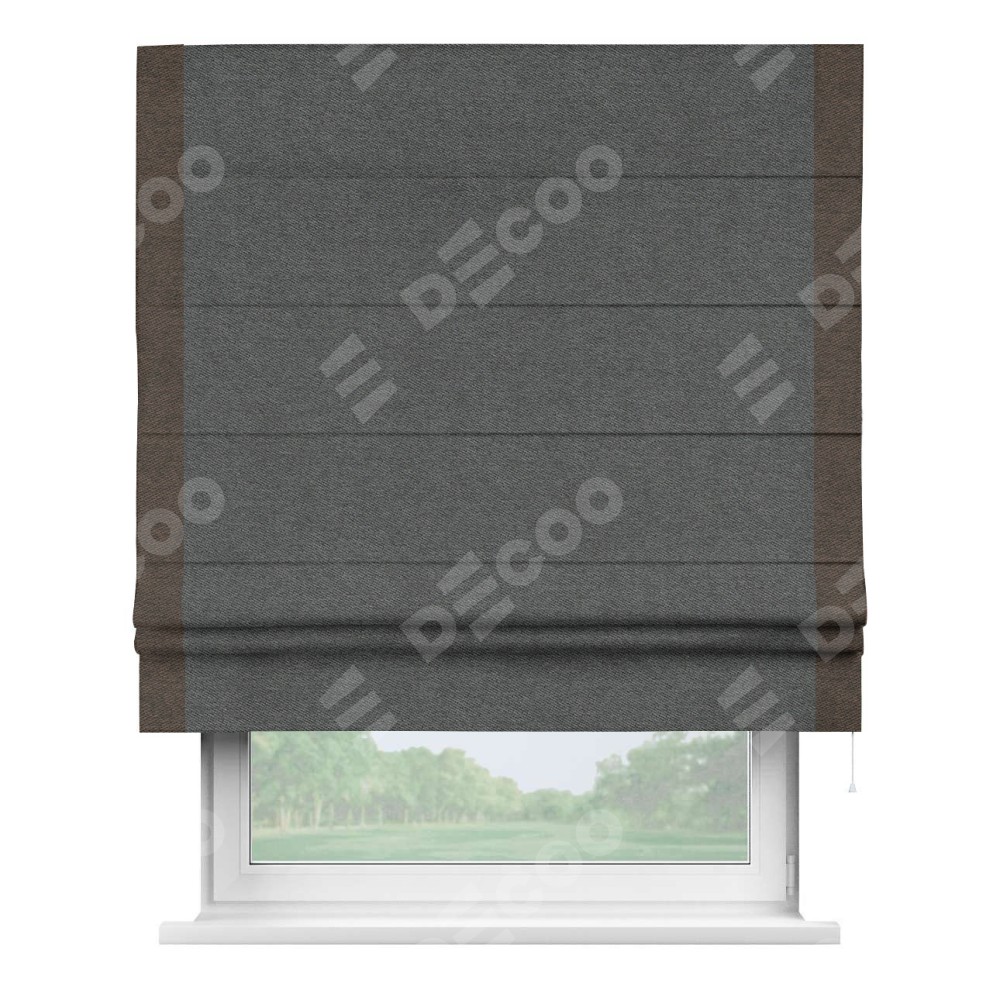 Римская штора производителя «Cortin», используется для проёма, пошита из ткани твид блэкаут тёмно-серый, артикул 90938. Отделка шторы кантом «Стрим Дуо», ткань для канта используется из твида разной расцветки на выбор. Имеет универсальный механизм и подходит для монтажа: на потолок, на стену и в нишу.