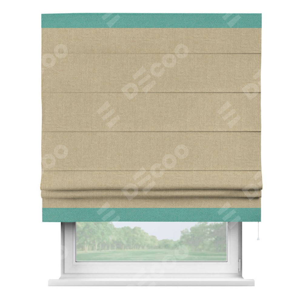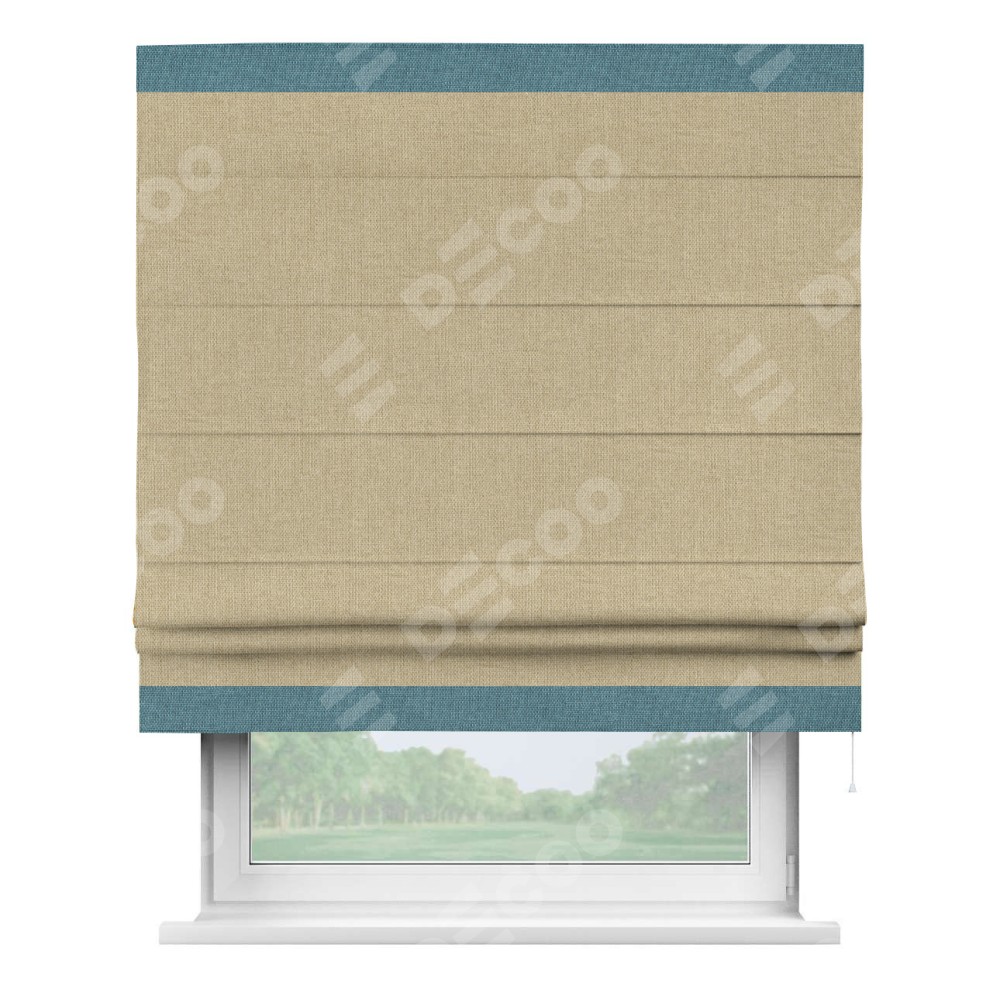 Римская штора пошита из ткани лён димаут песочный, артикул: 16256, с отделкой кантом «Горизонт» предлагает уникальное дизайнерское решение, при котором кант располагается только вверху и снизу шторы. Такое решение делает акцент на горизонтальных линиях, визуально расширяя пространство и придавая окну более строгий и организованный вид. Отделка кантом в этих ключевых местах не только украшает штору, но и способствует её долговечности, защищая наиболее уязвимые к износу края.