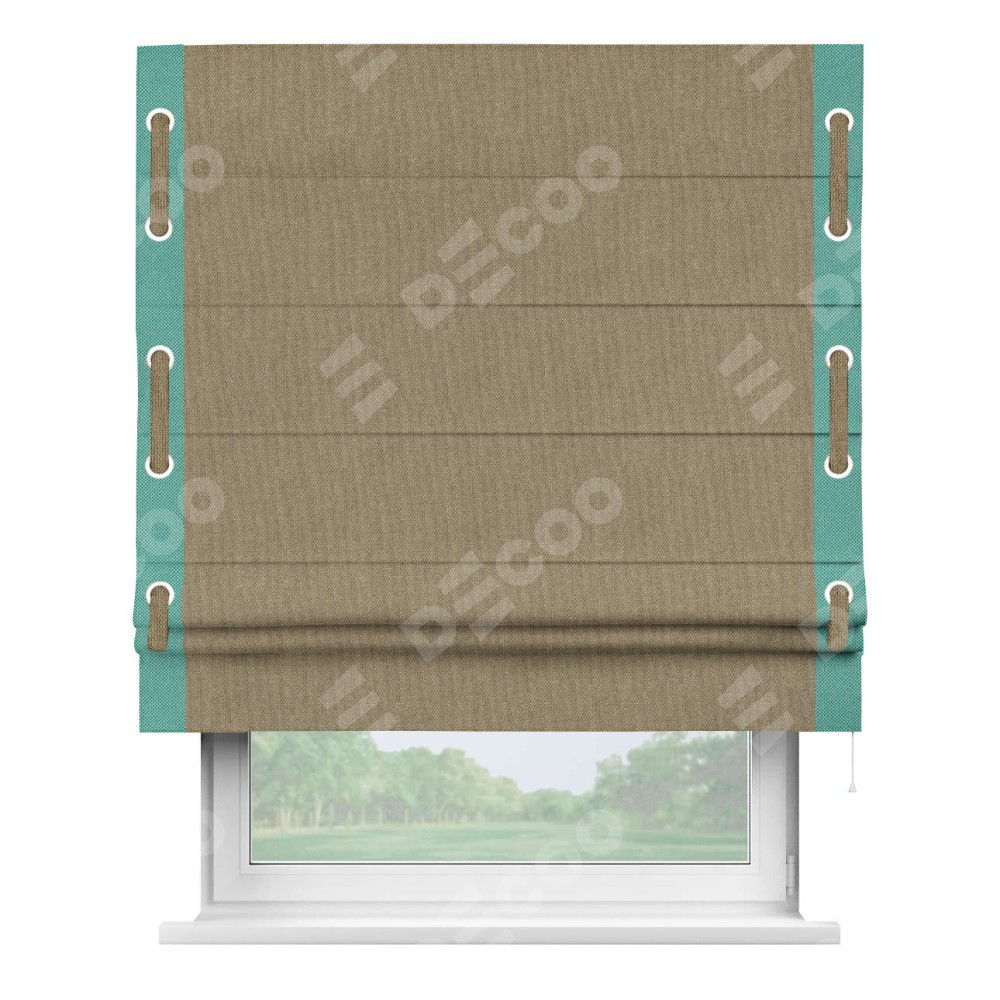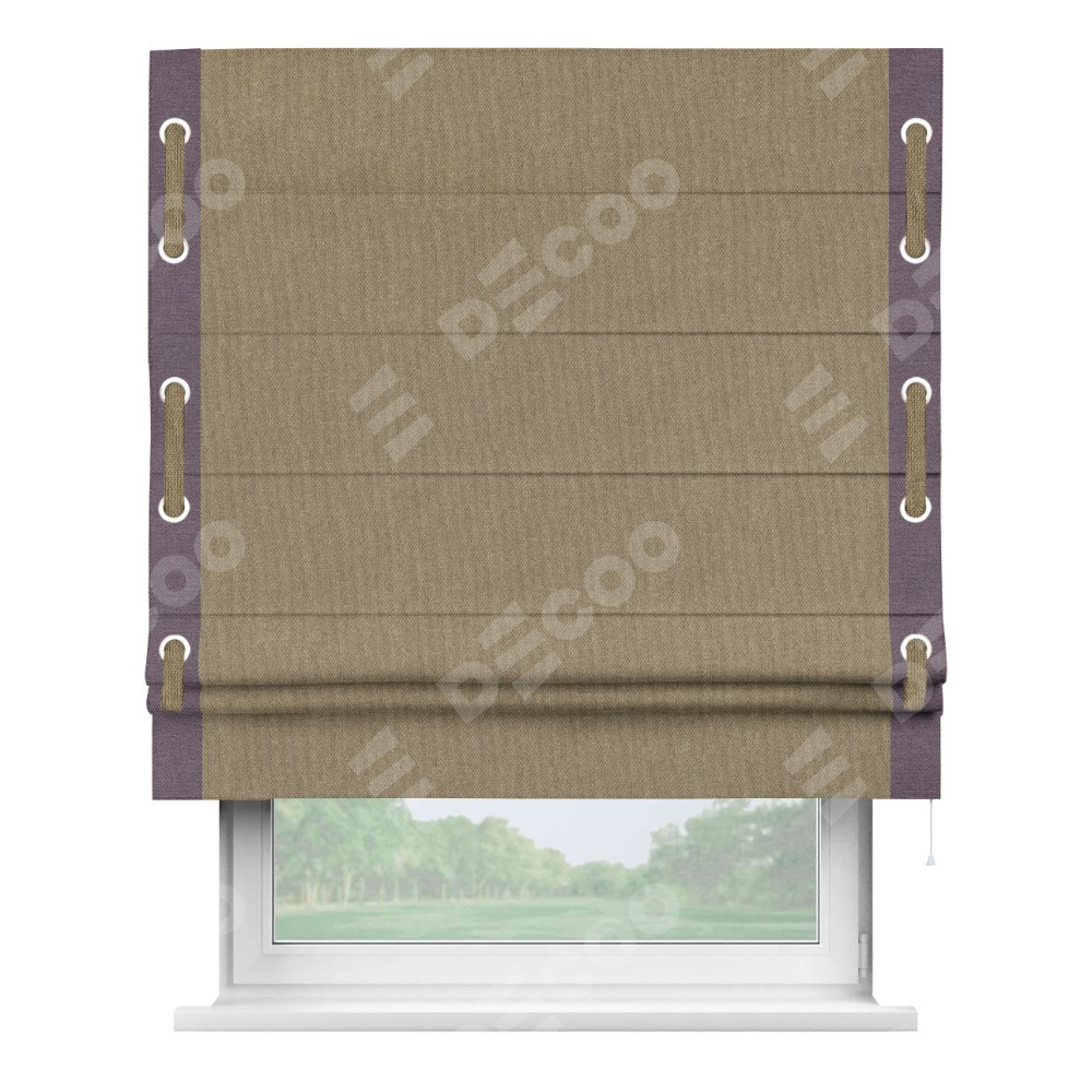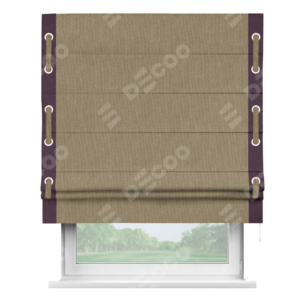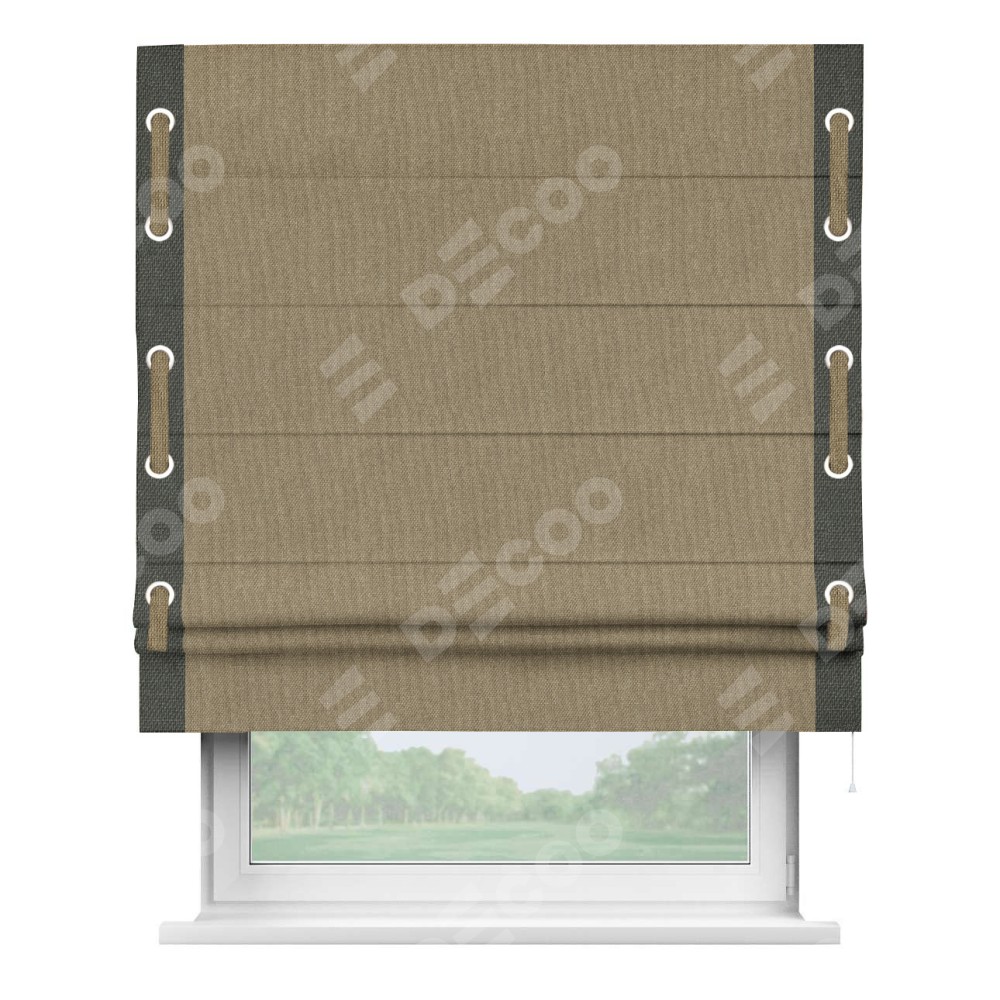 Римская штора пошита из ткани лён димаут тёмно-бежевый, артикул: 16261, с отделкой кантом «Стрим Дуо», дополненная декоративными люверсами на этих кантах и протянутым пояском из основного цвета римской шторы, представляет собой высоко декоративное и функциональное решение для оконного оформления. Канты, расположенные по обеим боковым сторонам шторы, уже добавляют изысканности и завершенности внешнему виду. Добавление люверсов и пояска не только усиливает декоративный эффект, но и придает шторе дополнительную текстурность и глубину.