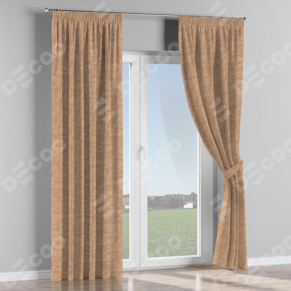 Комплект прямых штор, от производителя «Cortin», пошиты из ткани софт мрамор бронзовый, артикул ткани 93576. С изнаночной стороны в верхней части штор пристрачивается шторная лента с декоративными складками «Карандаш». Для создания элегантных складок прямые шторы шьются по стандарту с коэффициентом 1:2 (на 100 см. ширины проёма 200 см. ширины ткани).