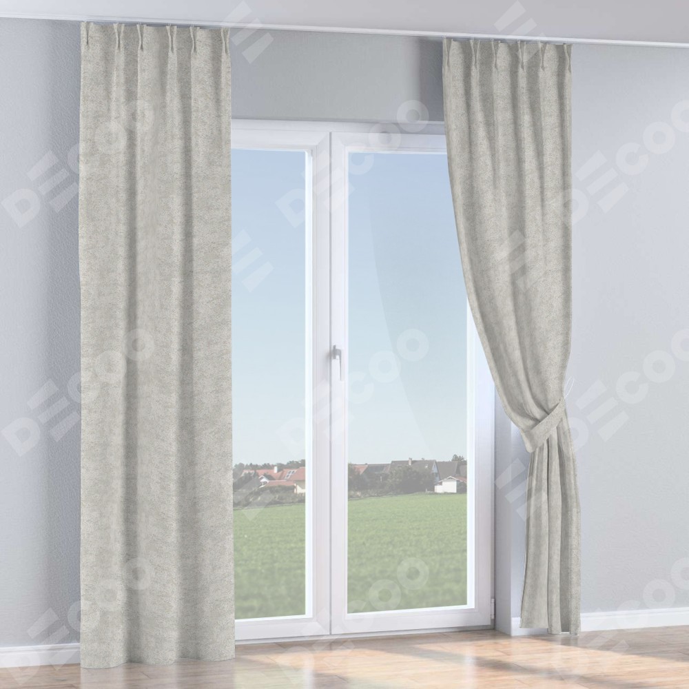 Комплект прямых штор, от производителя «Cortin», пошиты из ткани софт мрамор светло-серый, артикул ткани 93582. С изнаночной стороны в верхней части штор пристрачивается шторная лента с декоративными складками «Кустик». Для создания элегантных складок прямые шторы шьются по стандарту с коэффициентом 1:2 (на 100 см. ширины проёма 200 см. ширины ткани).