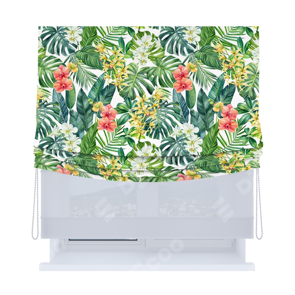 Римская штора день-ночь производителя «Cortin», используется для проёма, пошита из двух полотен, с лицевой блэкаут с нанесением сублимационной печати «Орхидеи в тропиках», вторая ткань тюль (по стандарту комплектуется тюль белого цвета артикул V-01). Имеет универсальный механизм и подходит для монтажа: на потолок, на стену и в нишу. Удобное управление каждой шторой отдельно.