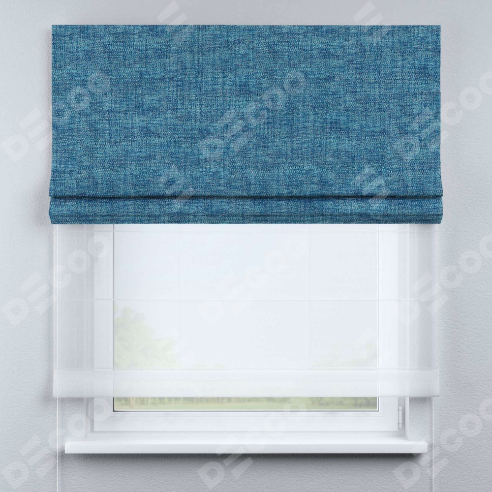 Двойная римская штора «День-ночь» от производителя Cortin предназначена для использования в проёмах. Эта штора уникальна тем, что состоит из двух полотен. На лицевой стороне находится рогожка димаут лазурно-синий (артикул: 91024), обеспечивающий эффективное затемнение. В комплект также входит вторая ткань — легкий белый тюль (артикул: V-01), который добавляет изящества и легкости оформлению окна. Кроме того, доступны и другие разновидности ткани тюль, выбор которых доступен по ссылке .