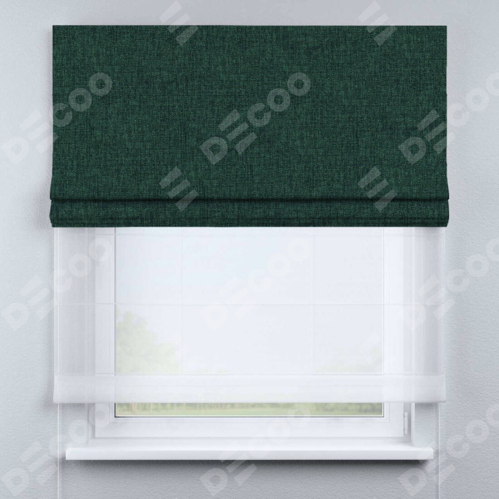 Двойная римская штора «День-ночь» от производителя Cortin предназначена для использования в проёмах. Эта штора уникальна тем, что состоит из двух полотен. На лицевой стороне находится рогожка димаут тёмно-зелёный (артикул: 91022), обеспечивающий эффективное затемнение. В комплект также входит вторая ткань — легкий белый тюль (артикул: V-01), который добавляет изящества и легкости оформлению окна. Кроме того, доступны и другие разновидности ткани тюль, выбор которых доступен по ссылке .