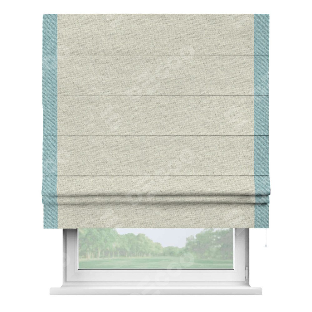 Римская штора пошита из ткани твид блэкаут шампань, артикул: 90929, с отделкой кантом «Стрим Дуо» выделяется наличием кантов по обоим бокам шторы, слева и справа. Этот дизайн придает шторе аккуратный и завершенный вид, акцентируя вертикальные линии и визуально вытягивая окно в высоту. Отделка кантом по бокам не только украшает штору, но и служит практической функцией, укрепляя края и продлевая срок службы изделия.