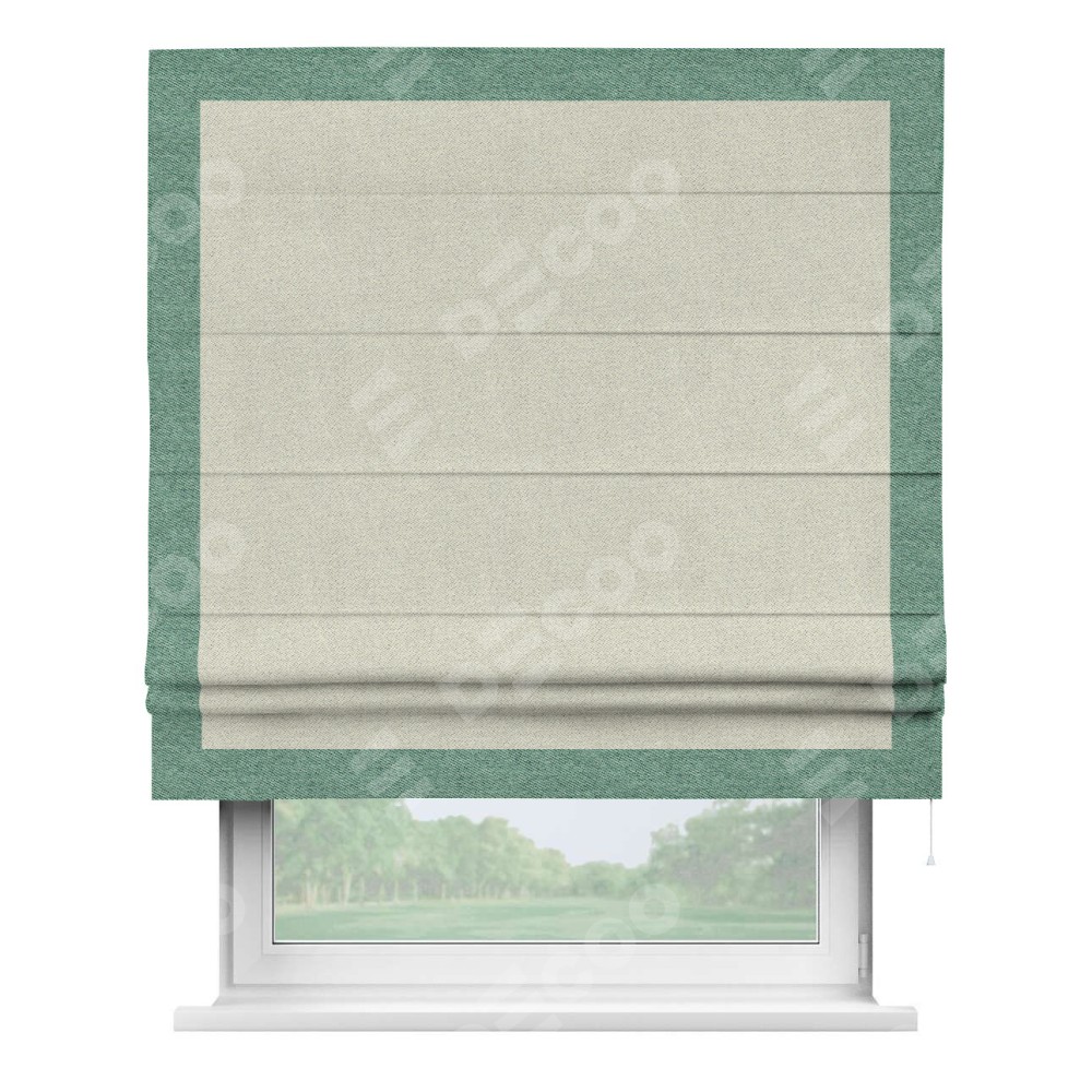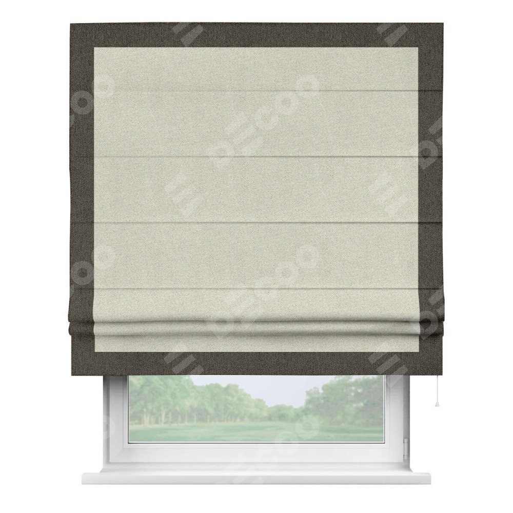 Римская штора пошита из ткани твид блэкаут шампань, артикул: 90929, с отделкой кантом «Чесс» отличается своей уникальной деталью — наличием канта не только по бокам и снизу, но и сверху по всем краям шторы. Это придает шторе особенно аккуратный и завершенный вид, делая акцент на границах и форме шторы. Отделка кантом по всему периметру шторы усиливает её декоративные качества и подчеркивает строгую геометрию, что может быть особенно актуально для современных и минималистичных интерьеров.