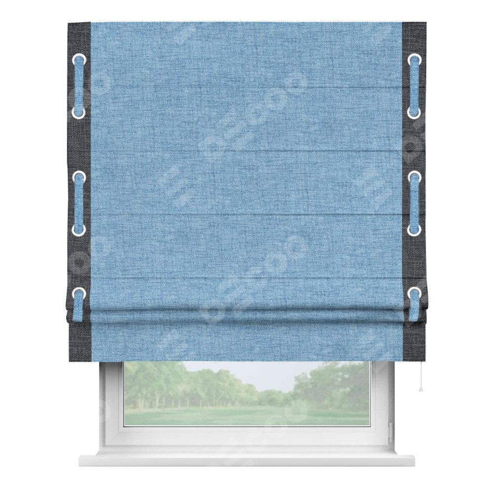 Римская штора «Кортин» для проёма, рогожка димаут голубой, с кантом Стрим Дуо (люверсы с пояском)