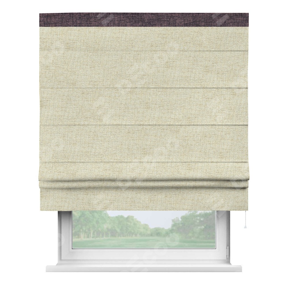 Римская штора пошита из ткани рогожка димаут золотой песок, артикул: 91015, с отделкой кантом «Кинг» отличается своей необычной особенностью: кант располагается исключительно сверху шторы. Такой дизайн делает акцент на верхней части окна, визуально поднимая потолок и придавая интерьеру более возвышенный и изысканный вид. Отделка кантом на верхней кромке не только украшает штору, но и может служить дополнительной защитой от износа в месте наибольшего контакта с механизмом управления шторой.