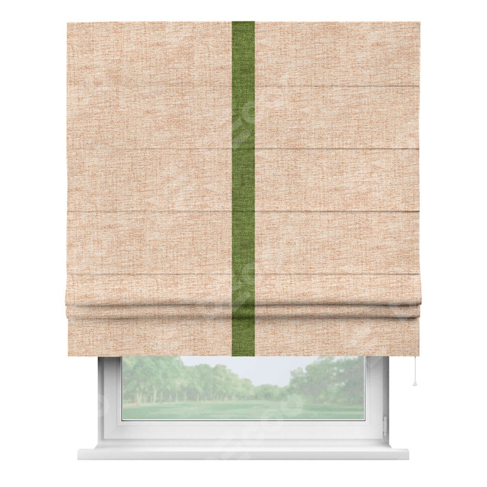 Римская штора пошита из ткани рогожка димаут персиковый, артикул: 91016, с отделкой кантом «Хайвэй» представляет собой уникальное и смелое дизайнерское решение, где кант расположен вертикально посередине шторы. Этот дизайн не только выделяет штору среди других вариантов оформления окон, но и создает интересный визуальный акцент, привлекая внимание к центру окна и разделяя штору на визуальные зоны. Такой нестандартный подход добавляет динамичности интерьеру и может быть использован для подчеркивания особенностей оформления помещения.