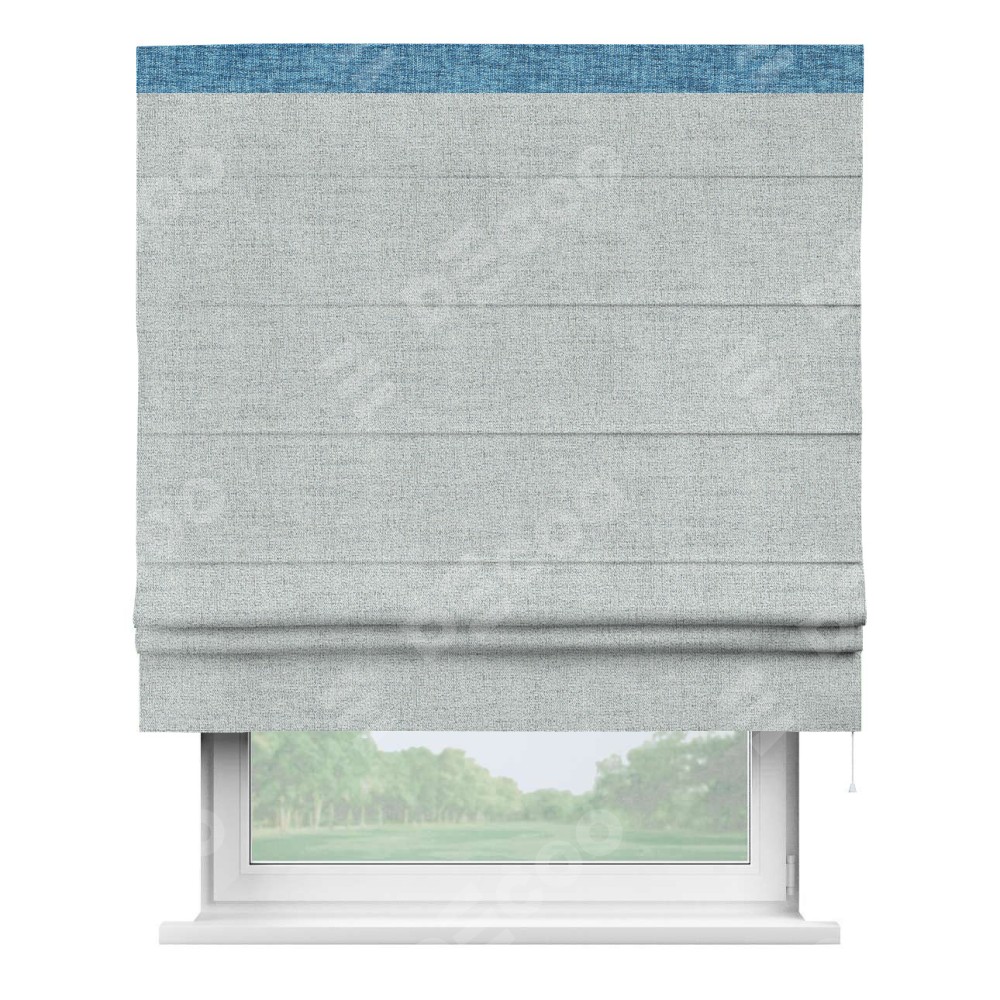 Римская штора пошита из ткани рогожка димаут серый, артикул: 91027, с отделкой кантом «Кинг» отличается своей необычной особенностью: кант располагается исключительно сверху шторы. Такой дизайн делает акцент на верхней части окна, визуально поднимая потолок и придавая интерьеру более возвышенный и изысканный вид. Отделка кантом на верхней кромке не только украшает штору, но и может служить дополнительной защитой от износа в месте наибольшего контакта с механизмом управления шторой.