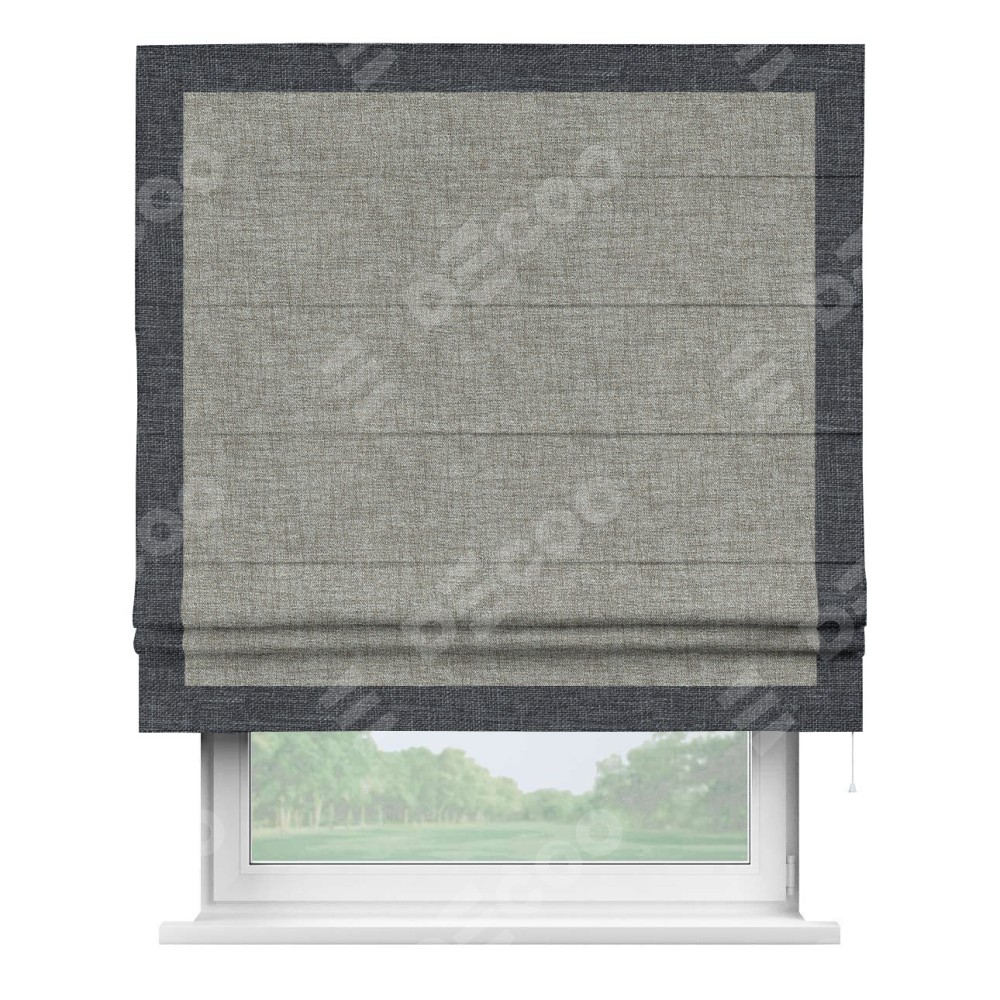 Римская штора пошита из ткани рогожка димаут серый дуб, артикул: 91028, с отделкой кантом «Чесс» отличается своей уникальной деталью — наличием канта не только по бокам и снизу, но и сверху по всем краям шторы. Это придает шторе особенно аккуратный и завершенный вид, делая акцент на границах и форме шторы. Отделка кантом по всему периметру шторы усиливает её декоративные качества и подчеркивает строгую геометрию, что может быть особенно актуально для современных и минималистичных интерьеров.
