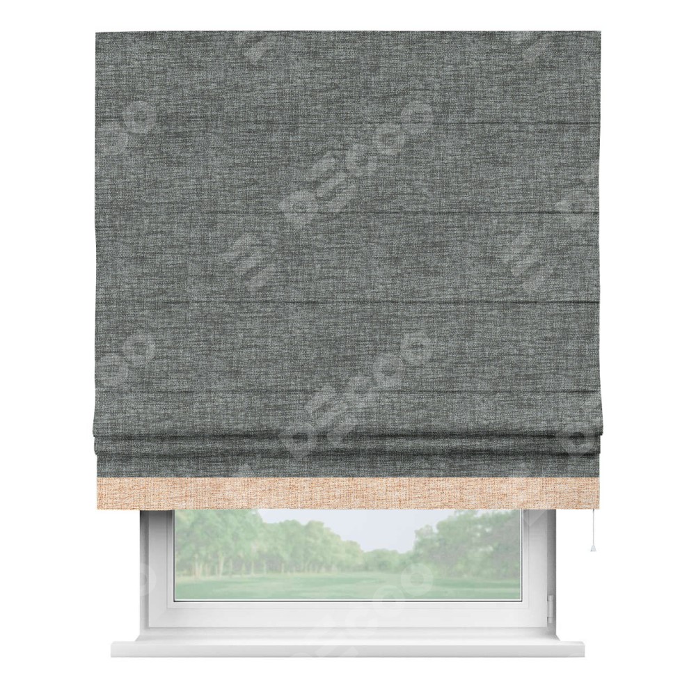 Римская штора пошита из ткани рогожка димаут тёмно-серый, артикул: 91029, с отделкой кантом «Джестер» выделяется своей уникальной особенностью — кантом, расположенным только снизу шторы. Этот дизайн добавляет оригинальности и игривости оконному оформлению, делая акцент на нижней части шторы и создавая интересный визуальный эффект. Отделка кантом на нижнем крае не только служит эстетической функции, но и способствует увеличению прочности и износостойкости ткани в этом месте.