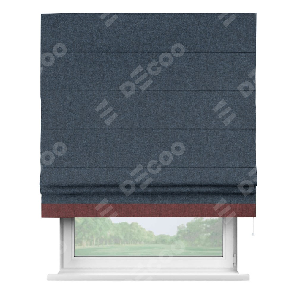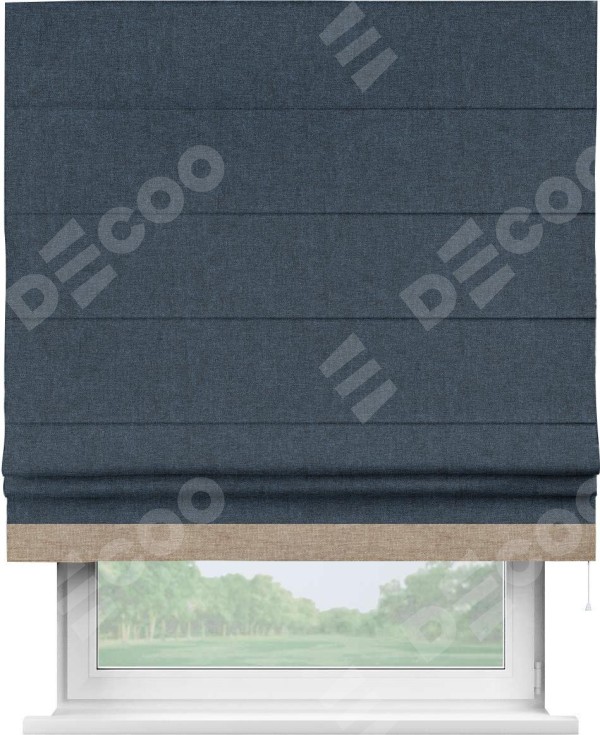 Римская штора пошита из ткани лён кашемир синий, артикул: 21623, с отделкой кантом «Джестер» выделяется своей уникальной особенностью — кантом, расположенным только снизу шторы. Этот дизайн добавляет оригинальности и игривости оконному оформлению, делая акцент на нижней части шторы и создавая интересный визуальный эффект. Отделка кантом на нижнем крае не только служит эстетической функции, но и способствует увеличению прочности и износостойкости ткани в этом месте.