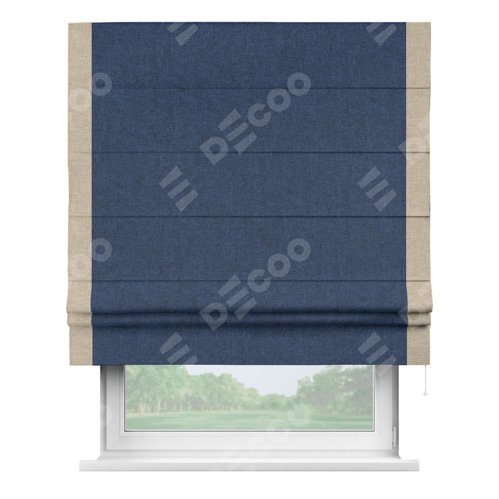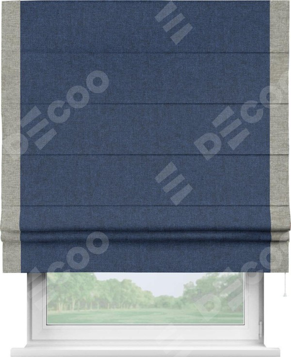 Римская штора пошита из ткани лён кашемир тёмно-синий, артикул: 17215, с отделкой кантом «Стрим Дуо» выделяется наличием кантов по обоим бокам шторы, слева и справа. Этот дизайн придает шторе аккуратный и завершенный вид, акцентируя вертикальные линии и визуально вытягивая окно в высоту. Отделка кантом по бокам не только украшает штору, но и служит практической функцией, укрепляя края и продлевая срок службы изделия.