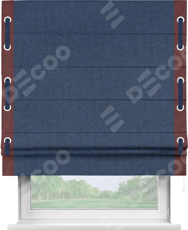 Римская штора «Кортин» для проёма, лён кашемир тёмно-синий, с кантом Стрим Дуо (люверсы с пояском)