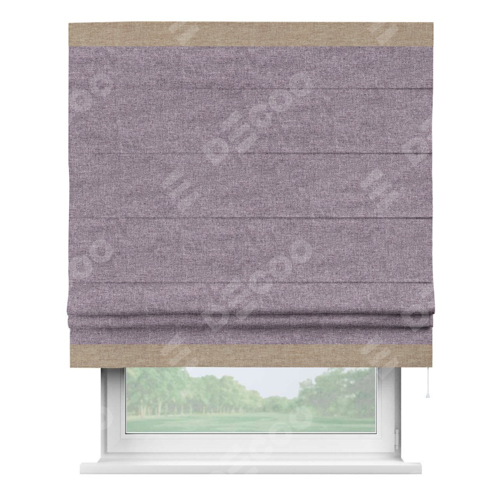 Римская штора пошита из ткани лён кашемир фиолетовый, артикул: 17211, с отделкой кантом «Горизонт» предлагает уникальное дизайнерское решение, при котором кант располагается только вверху и снизу шторы. Такое решение делает акцент на горизонтальных линиях, визуально расширяя пространство и придавая окну более строгий и организованный вид. Отделка кантом в этих ключевых местах не только украшает штору, но и способствует её долговечности, защищая наиболее уязвимые к износу края.