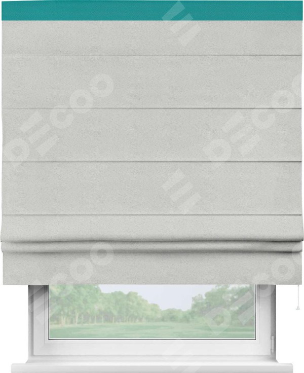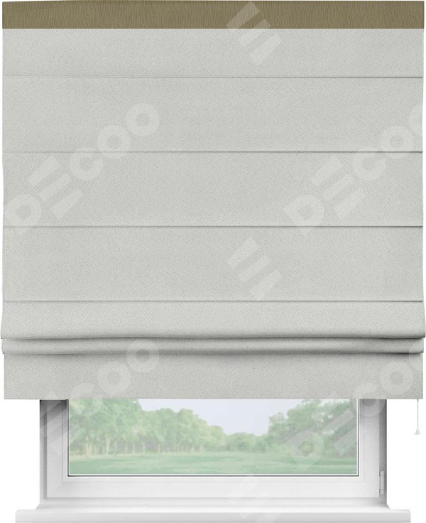 Римская штора пошита из ткани однотонный блэкаут милк, артикул: 23, с отделкой кантом «Кинг» отличается своей необычной особенностью: кант располагается исключительно сверху шторы. Такой дизайн делает акцент на верхней части окна, визуально поднимая потолок и придавая интерьеру более возвышенный и изысканный вид. Отделка кантом на верхней кромке не только украшает штору, но и может служить дополнительной защитой от износа в месте наибольшего контакта с механизмом управления шторой.