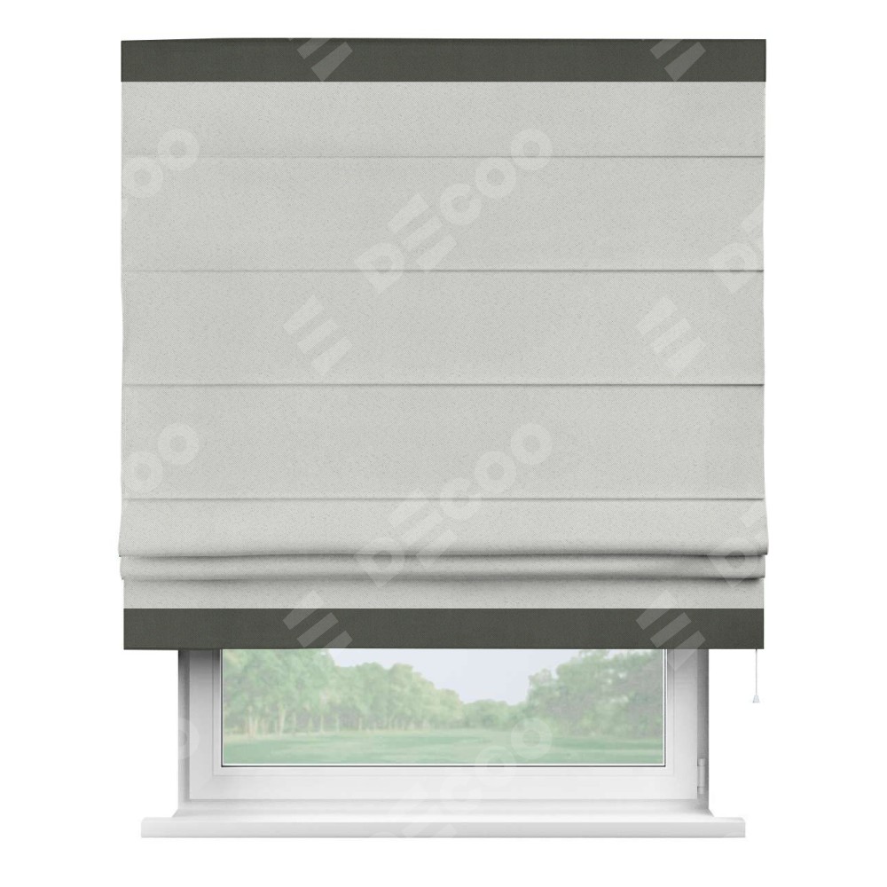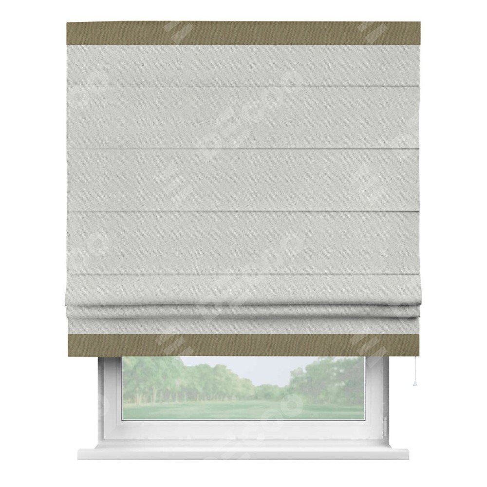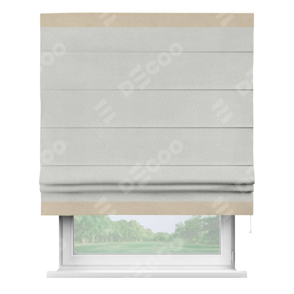 Римская штора пошита из ткани однотонный блэкаут милк, артикул: 23, с отделкой кантом «Горизонт» предлагает уникальное дизайнерское решение, при котором кант располагается только вверху и снизу шторы. Такое решение делает акцент на горизонтальных линиях, визуально расширяя пространство и придавая окну более строгий и организованный вид. Отделка кантом в этих ключевых местах не только украшает штору, но и способствует её долговечности, защищая наиболее уязвимые к износу края.