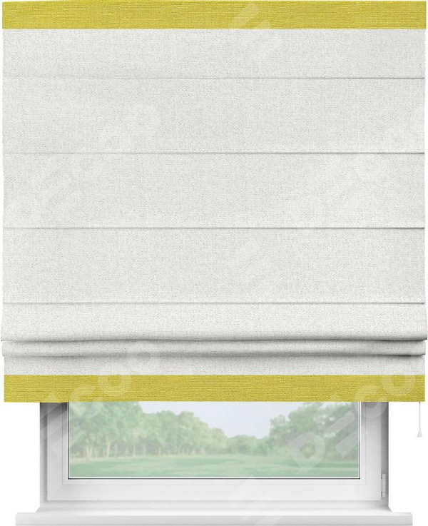 Римская штора пошита из ткани лён шампань, артикул: 91399, с отделкой кантом «Горизонт» предлагает уникальное дизайнерское решение, при котором кант располагается только вверху и снизу шторы. Такое решение делает акцент на горизонтальных линиях, визуально расширяя пространство и придавая окну более строгий и организованный вид. Отделка кантом в этих ключевых местах не только украшает штору, но и способствует её долговечности, защищая наиболее уязвимые к износу края.